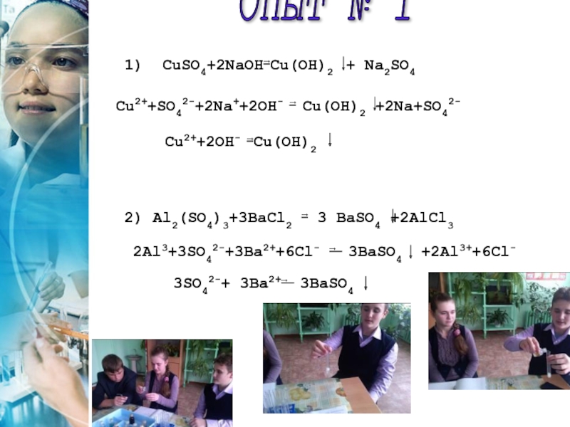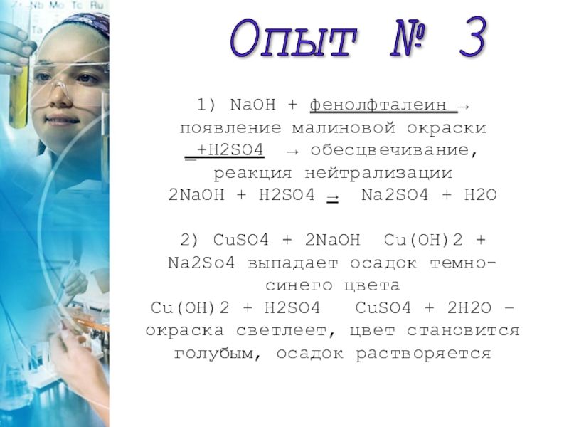 2) CuSO4 + 2NaOH Cu(OH)2 + Na2So4 выпадает осадок темно-синего цвета