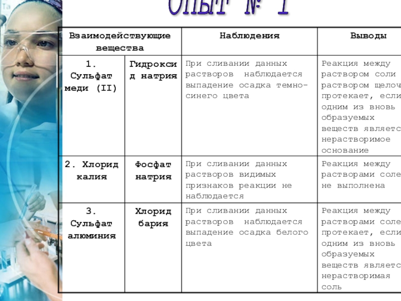 2. Растворы щелочей взаимодействуют с растворами солей при условии, что одно из вновь образующихся веществ выпадает в осадок.