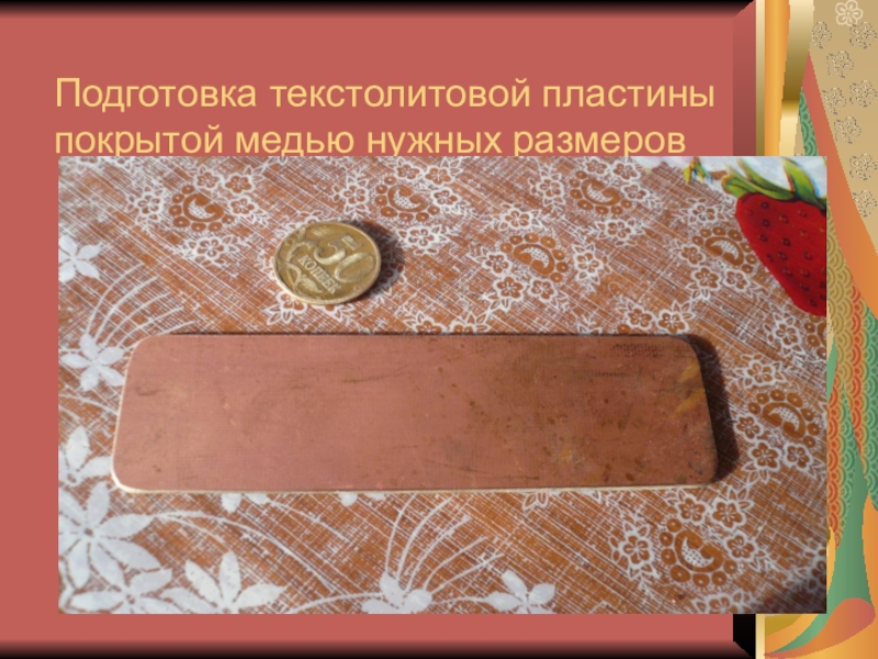 Слайд 10Подготовка текстолитовой пластины покрытой медью нужных размеров