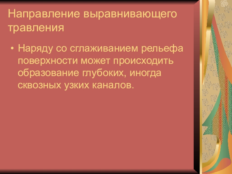 Направление выравнивающего травленияНаряду со сглаживанием рельефа поверхности может происходить образование глубоких, иногда сквозных узких каналов.