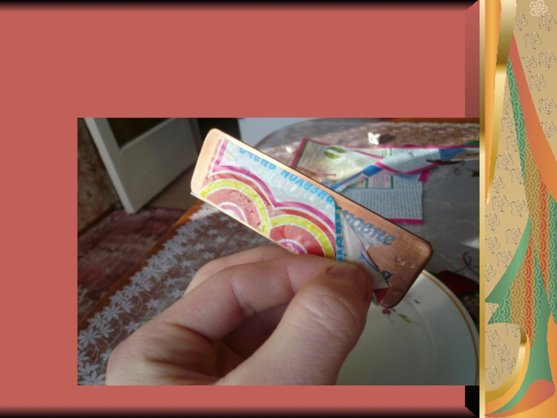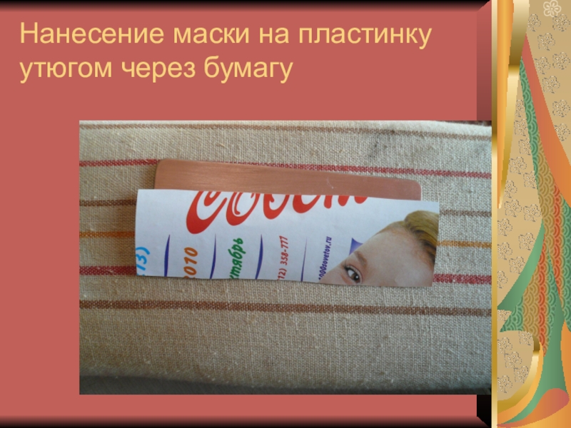 Слайд 13Нанесение маски на пластинку утюгом через бумагу
