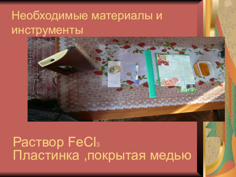 Необходимые материалы и инструменты  Раствор FeCl3Пластинка ,покрытая медью
