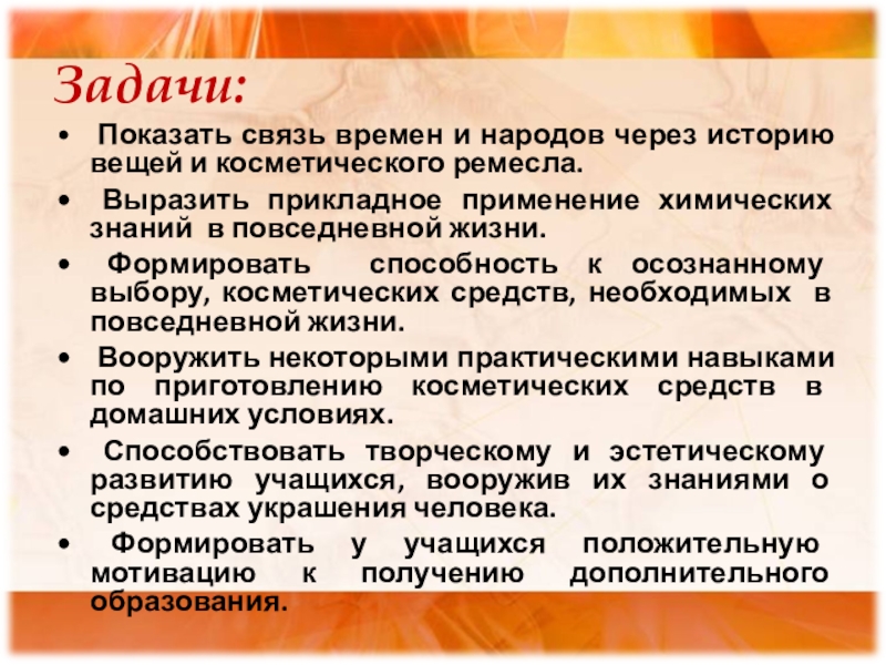 Способствовать творческому и эстетическому развитию учащихся, вооружив их знаниями о средствах украшения человека.
