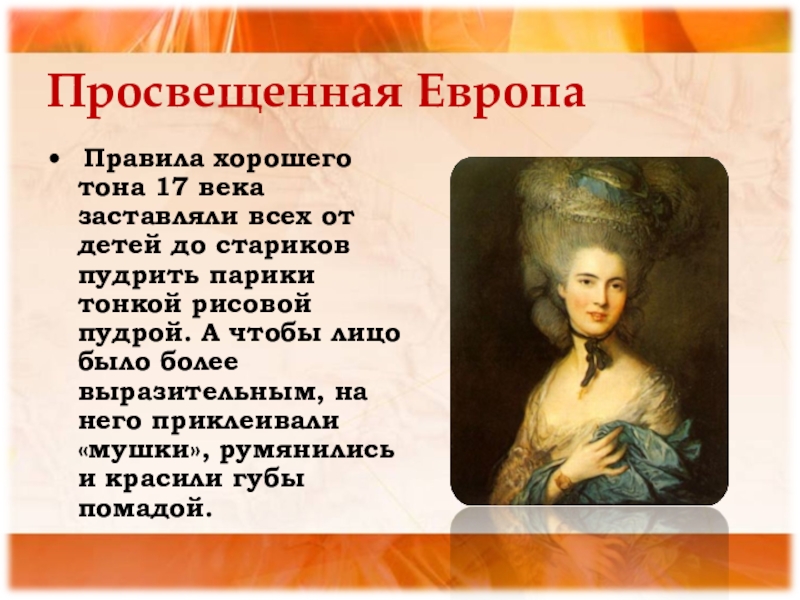 до стариков пудрить парики тонкой рисовой пудрой. А чтобы лицо было более выразительным, на него приклеивали «мушки», румянились и красили губы помадой.