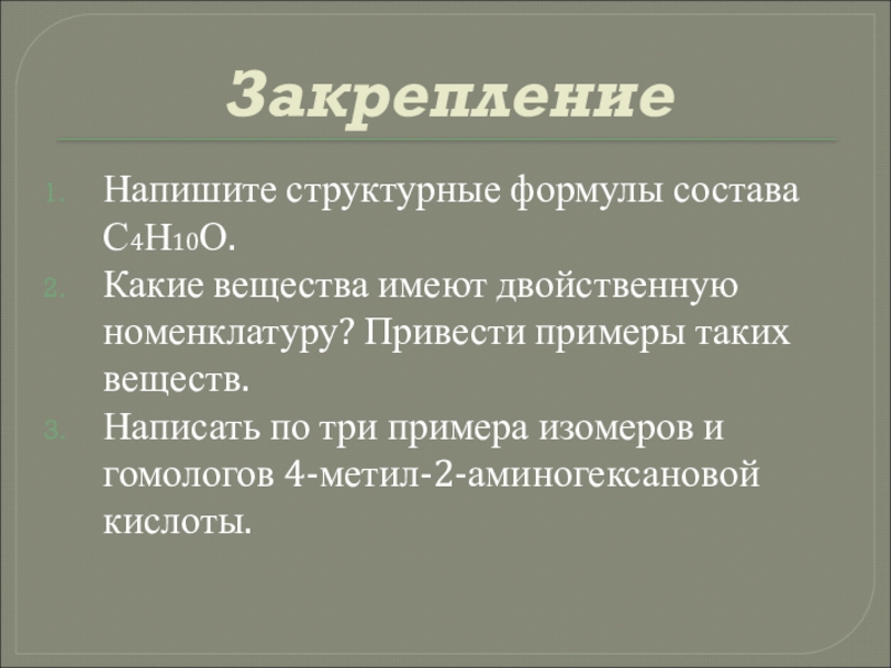 Написать по три примера изомеров и гомологов 4-метил-2-аминогексановой кислоты.