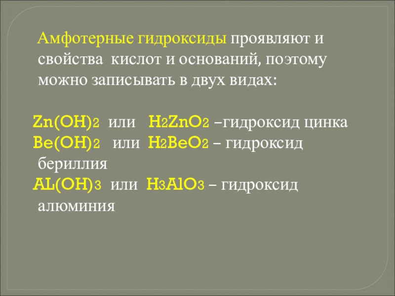 Слайд 6 Амфотерные гидроксиды проявляют и свойства кислот и оснований, поэтому