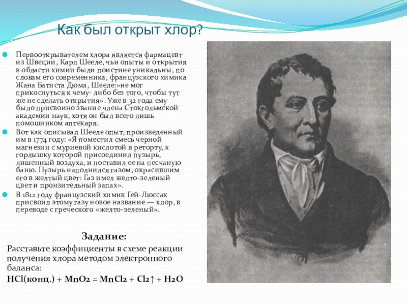 Первооткрывателем хлора является фармацевт из Швеции, Карл Шееле, чьи опыты и открытия в области химии были поистине уникальны, по словам его современника, французского химика Жана Батиста Дюма, Шееле:»не мог прикоснуться к чему- либо без того, чтобы тут же не сделать открытия». Уже в 32 года ему было присвоино звание члена Стокгольмской академии наук, хотя он был всего лишь помошником аптекаря.