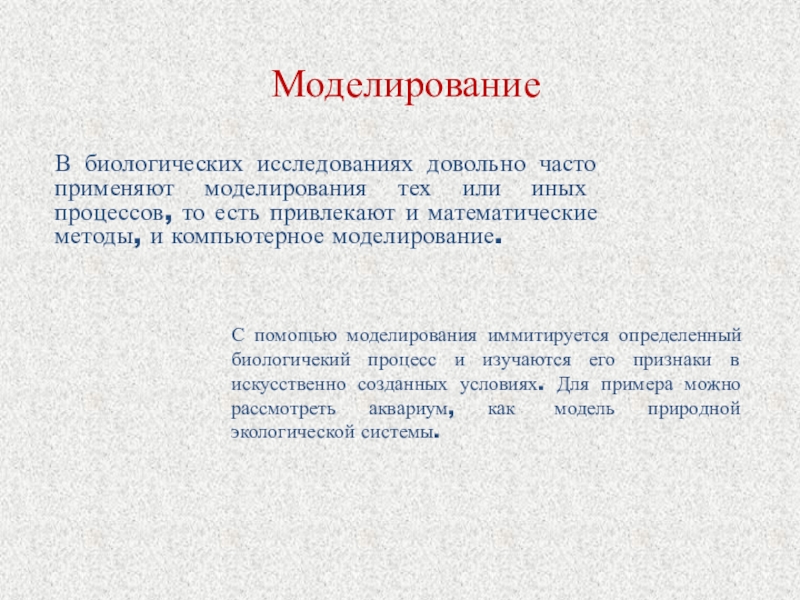 С помощью моделирования иммитируется определенный биологичекий процесс и изучаются его признаки в искусственно созданных условиях. Для примера можно рассмотреть аквариум, как модель природной экологической системы.