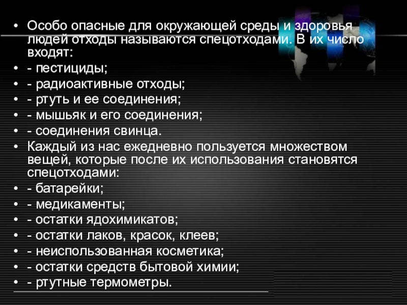 Слайд 18Особо опасные для окружающей среды и здоровья людей отходы называются спецотходами.