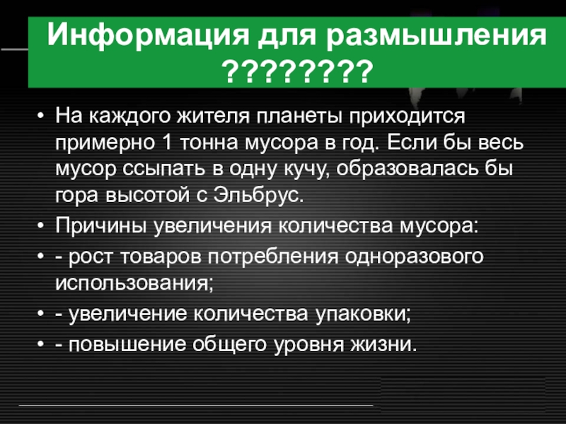 в год. Если бы весь мусор ссыпать в одну кучу, образовалась бы гора высотой с Эльбрус.