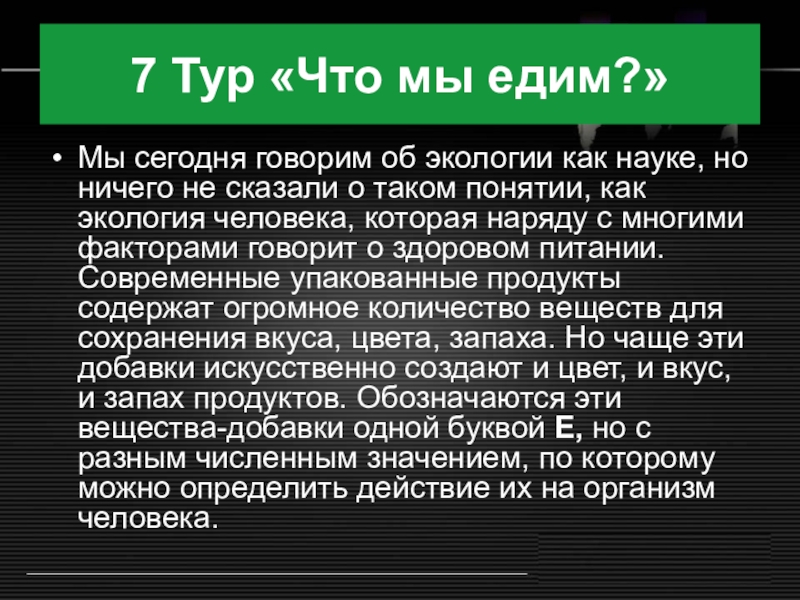 но ничего не сказали о таком понятии, как экология человека, которая наряду с многими факторами говорит о здоровом питании. Современные упакованные продукты содержат огромное количество веществ для сохранения вкуса, цвета, запаха. Но чаще эти добавки искусственно создают и цвет, и вкус, и запах продуктов. Обозначаются эти вещества-добавки одной буквой Е, но с разным численным значением, по которому можно определить действие их на организм человека.
