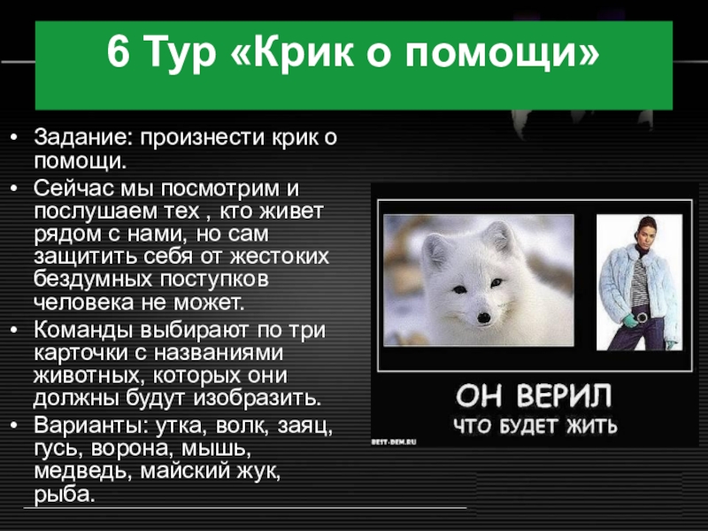 Варианты: утка, волк, заяц, гусь, ворона, мышь, медведь, майский жук, рыба.