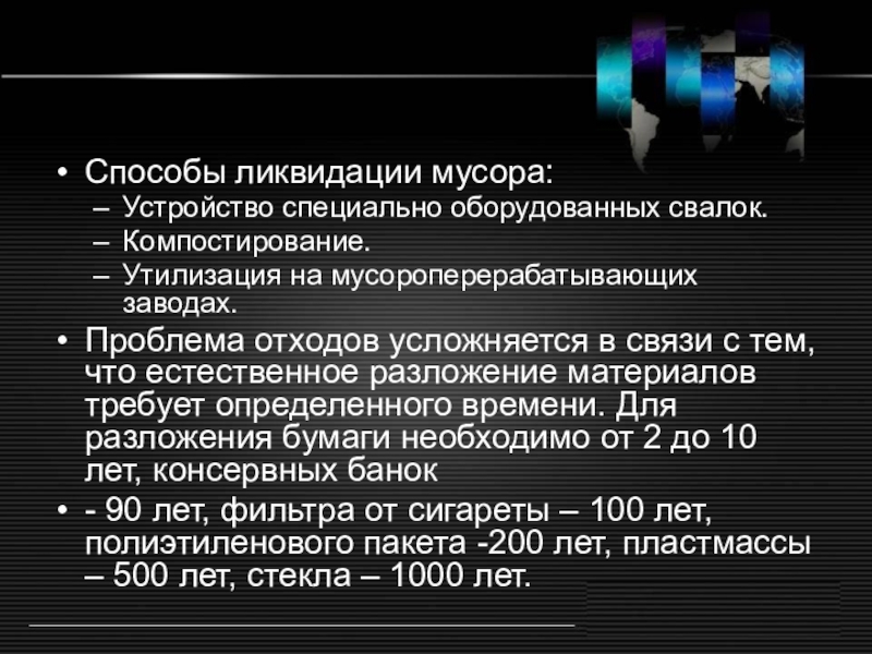 - 90 лет, фильтра от сигареты – 100 лет, полиэтиленового пакета -200 лет, пластмассы – 500 лет, стекла – 1000 лет.
