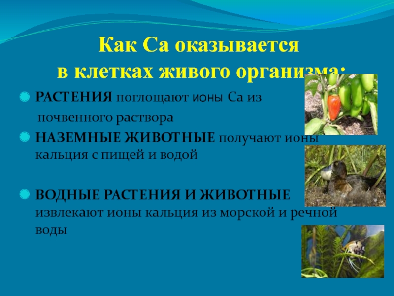 Как Ca оказывается  в клетках живого организма:РАСТЕНИЯ поглощают ионы Ca из   почвенного раствораНАЗЕМНЫЕ ЖИВОТНЫЕ