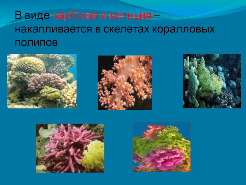 Слайд 24В виде карбоната кальция – накапливается в скелетах коралловых полипов
