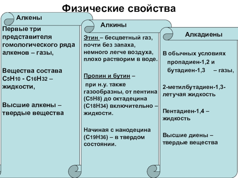при н.у. также газообразны, от пентина (С5Н8) до октадецина (С18Н34) включительно – жидкости.