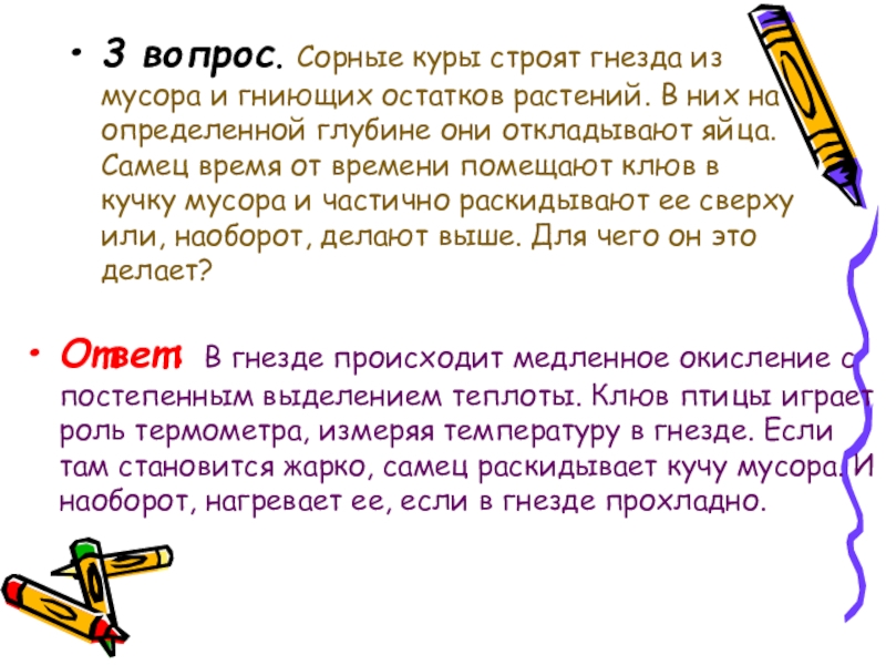 Ответ: В гнезде происходит медленное окисление с постепенным выделением теплоты. Клюв птицы играет роль термометра, измеряя температуру в гнезде. Если там становится жарко, самец раскидывает кучу мусора. И наоборот, нагревает ее, если в гнезде прохладно.