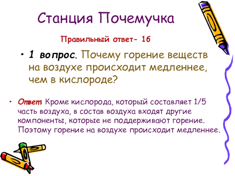 Ответ: Кроме кислорода, который составляет 1/5 часть воздуха, в состав воздуха входят другие компоненты, которые не поддерживают горение. Поэтому горение на воздухе происходит медленнее.