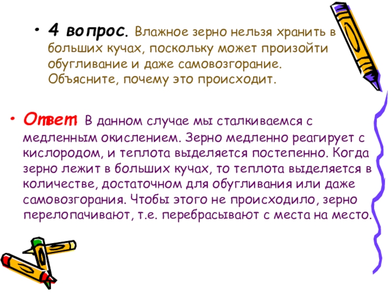 Ответ: В данном случае мы сталкиваемся с медленным окислением. Зерно медленно реагирует с кислородом, и теплота выделяется постепенно. Когда зерно лежит в больших кучах, то теплота выделяется в количестве, достаточном для обугливания или даже самовозгорания. Чтобы этого не происходило, зерно перелопачивают, т.е. перебрасывают с места на место.