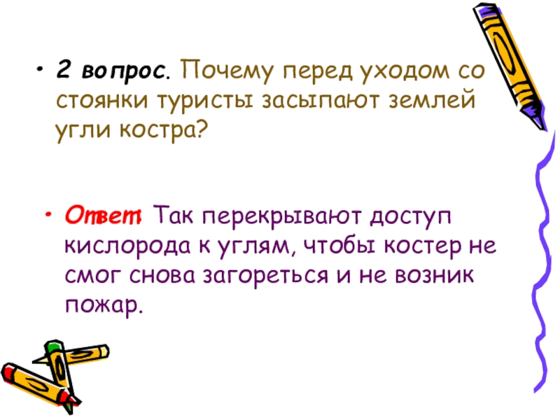 Ответ: Так перекрывают доступ кислорода к углям, чтобы костер не смог снова загореться и не возник пожар.