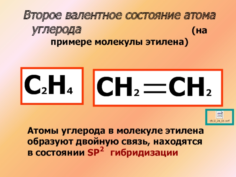 Атомы углерода в молекуле этилена образуют двойную связь, находятся в состоянии SP гибридизации