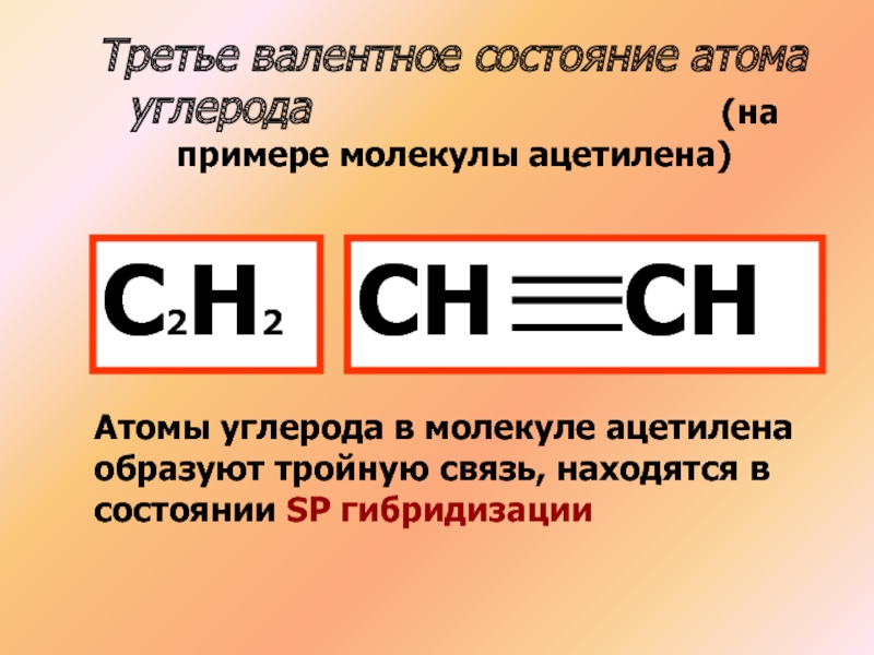 Атомы углерода в молекуле ацетилена образуют тройную связь, находятся в состоянии SP гибридизации