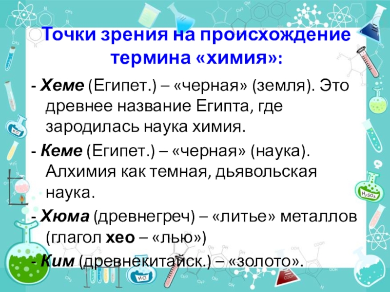 Точки зрения на происхождение термина «химия»: - Хеме (Египет.) – «черная» (земля). Это древнее название