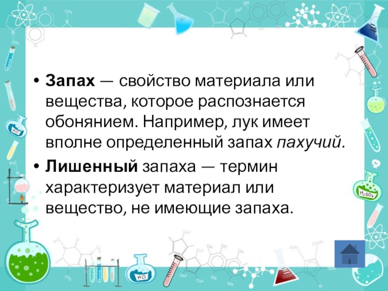 Запах — свойство материала или вещества, которое распознается обонянием. Например, лук имеет вполне определенный запах пахучий.Лишенный запаха