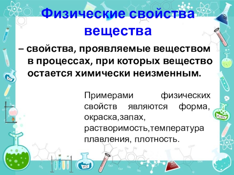 Физические свойства вещества– свойства, проявляемые веществом в процессах, при которых вещество остается химически неизменным.Примерами физических свойств являются