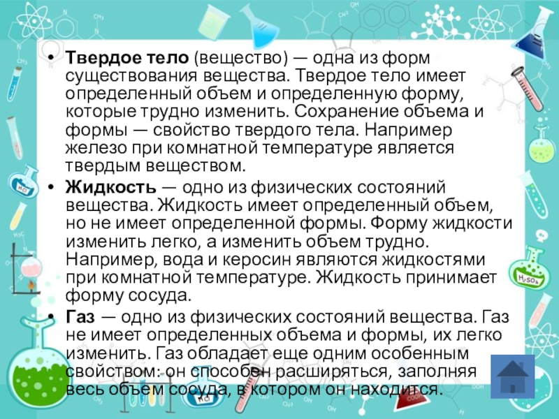 Твердое тело (вещество) — одна из форм существования вещества. Твердое тело имеет определенный объем и определенную форму,