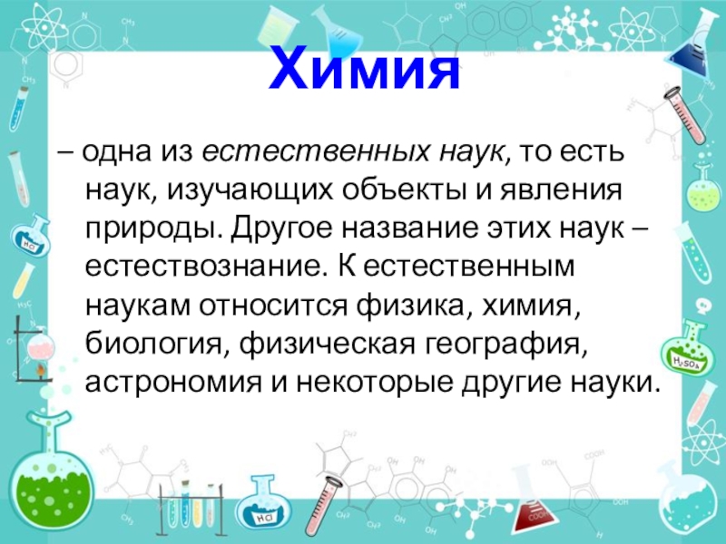 Химия– одна из естественных наук, то есть наук, изучающих объекты и явления природы. Другое название этих наук