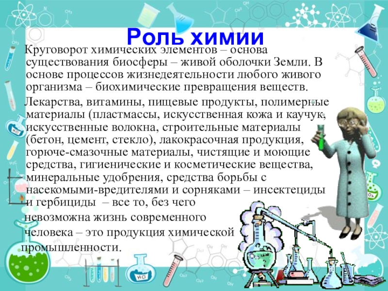 Роль химии   Круговорот химических элементов – основа существования биосферы – живой оболочки Земли. В основе