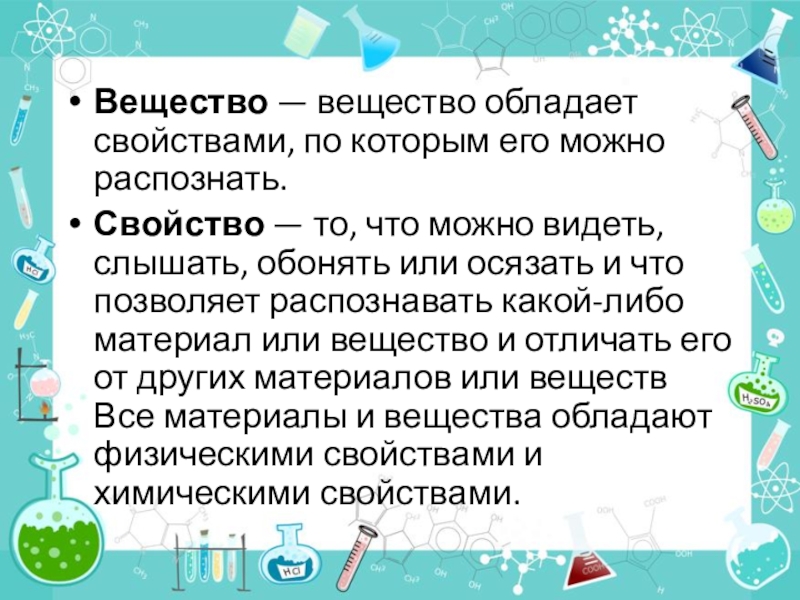 Вещество — вещество обладает свойствами, по которым его можно распознать. Свойство — то, что можно видеть, слышать,