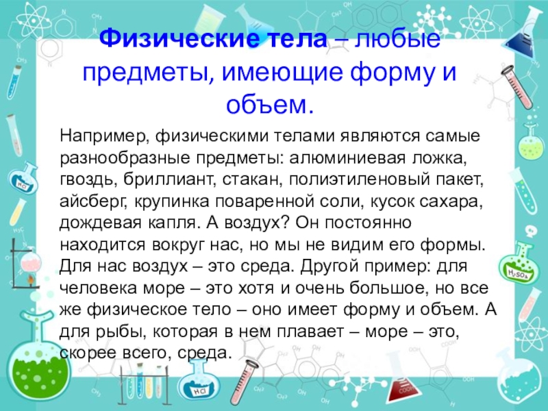 Физические тела – любые предметы, имеющие форму и объем. Например, физическими телами являются самые разнообразные предметы: алюминиевая ложка, гвоздь, бриллиант, стакан, полиэтиленовый пакет, айсберг, крупинка поваренной соли, кусок сахара, дождевая капля. А воздух? Он
