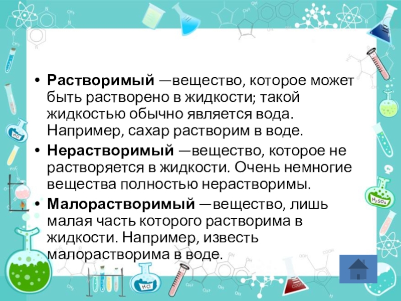 Растворимый —вещество, которое может быть растворено в жидкости; такой жидкостью обычно является вода. Например, сахар растворим в