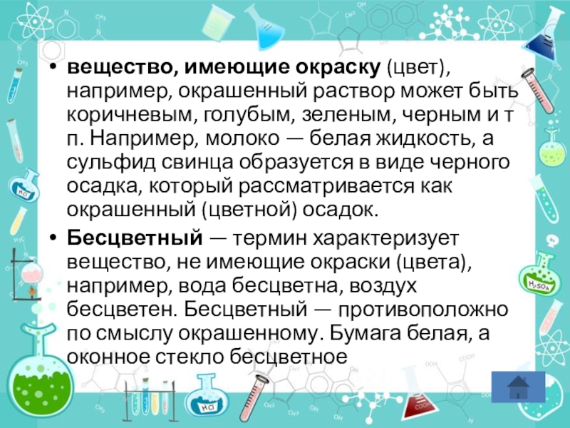 вещество, имеющие окраску (цвет), например, окрашенный раствор может быть коричневым, голубым,
