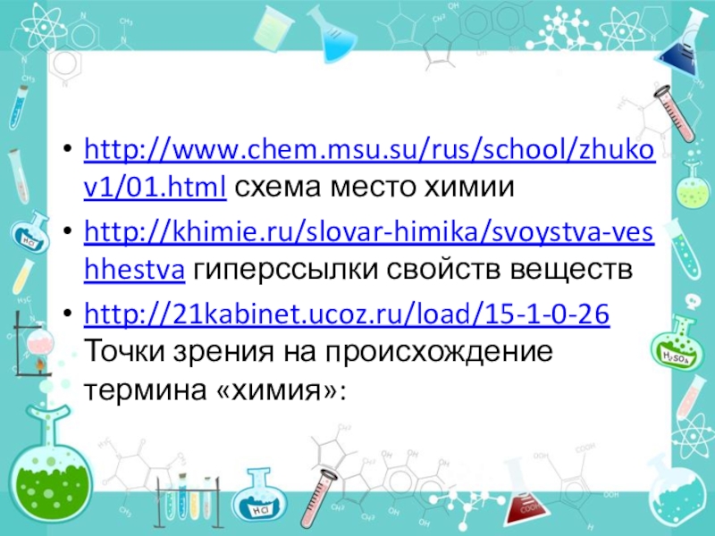 http://www.chem.msu.su/rus/school/zhukov1/01.html схема место химии http://khimie.ru/slovar-himika/svoystva-veshhestva гиперссылки свойств веществhttp://21kabinet.ucoz.ru/load/15-1-0-26 Точки зрения на происхождение термина «химия»: