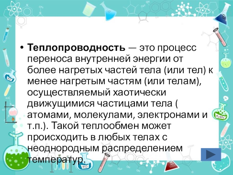 Теплопроводность — это процесс переноса внутренней энергии от более нагретых частей тела (или тел) к менее нагретым
