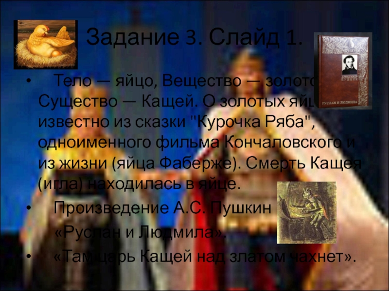 Существо — Кащей. О золотых яйцах известно из сказки "Курочка Ряба", одноименного фильма Кончаловского и из жизни (яйца Фаберже). Смерть Кащея (игла) находилась в яйце.