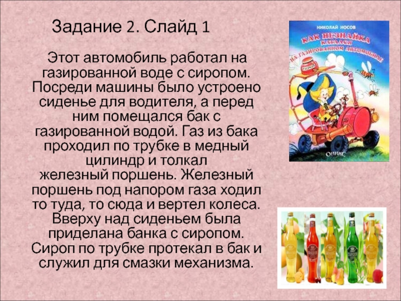 воде с сиропом. Посреди машины было устроено сиденье для водителя, а перед ним помещался бак с газированной водой. Газ из бака проходил по трубке в медный цилиндр и толкал