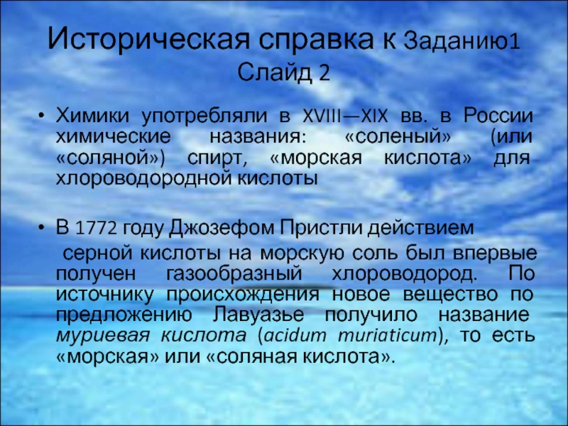 химические названия: «соленый» (или «соляной») спирт, «морская кислота» для хлороводородной кислоты