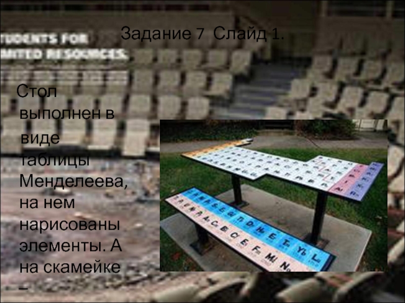 таблицы Менделеева, на нем нарисованы элементы. А на скамейке – лантаноиды и актиноиды