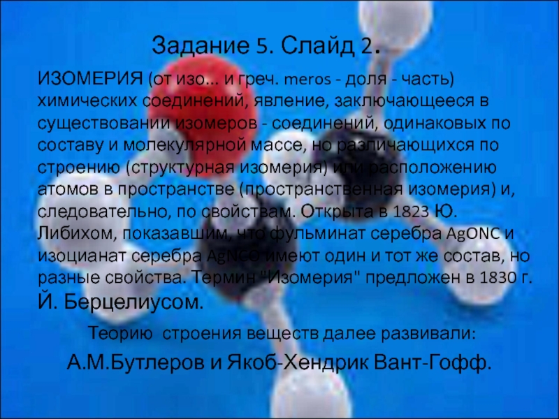 meros - доля - часть) химических соединений, явление, заключающееся в существовании изомеров - соединений, одинаковых по составу и молекулярной массе, но различающихся по строению (структурная изомерия) или расположению атомов в пространстве (пространственная изомерия) и, следовательно, по свойствам. Открыта в 1823 Ю. Либихом, показавшим, что фульминат серебра AgONC и изоцианат серебра AgNCO имеют один и тот же состав, но разные свойства. Термин "Изомерия" предложен в 1830 г. Й. Берцелиусом.