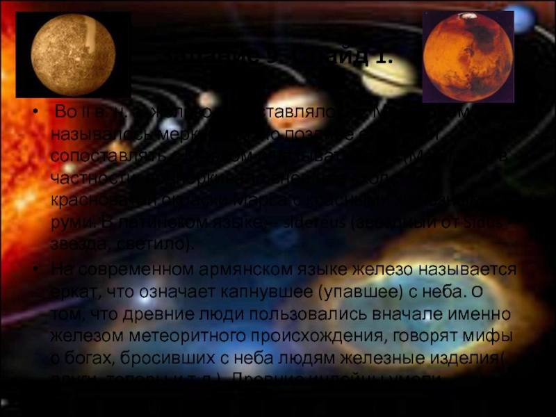 Меркурием и называлось меркурием, но позднее его стали сопоставлять с Марсом и называть марс (Mars), что, в частности, подчеркивало внешнее сходство красноватой окраски Марса с красными железными руми. В латинском языке,-- sidereus (звездный от Sidus - звезда, светило).