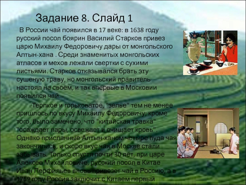17 веке: в 1638 году русский посол боярин Василий Старков привез царю Михаилу Федоровичу дары от монгольского Алтын-хана . Среди знаменитых монгольских атласов и мехов лежали свертки с сухими листьями. Старков отказывался брать эту сушеную траву, но монгольский правитель настоял на своем, и так впервые в Московии появился чай.