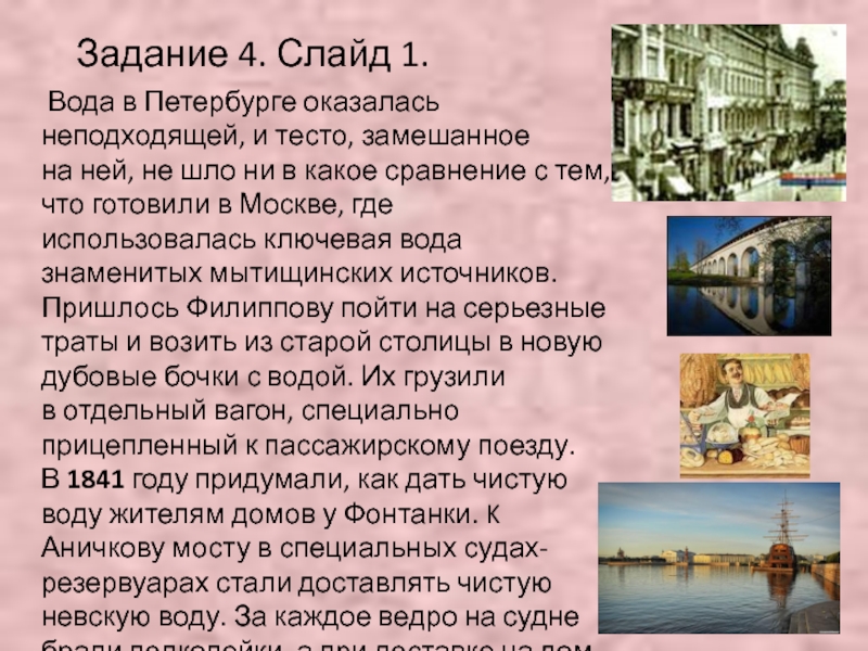 замешанное на ней, не шло ни в какое сравнение с тем, что готовили в Москве, где использовалась ключевая вода знаменитых мытищинских источников. Пришлось Филиппову пойти на серьезные траты и возить из старой столицы в новую дубовые бочки с водой. Их грузили в отдельный вагон, специально прицепленный к пассажирскому поезду. В 1841 году придумали, как дать чистую воду жителям домов у Фонтанки. K Аничкову мосту в специальных судах-резервуарах стали доставлять чистую невскую воду. За каждое ведро на судне брали полкопейки, а при доставке на дом - 2 копейки.