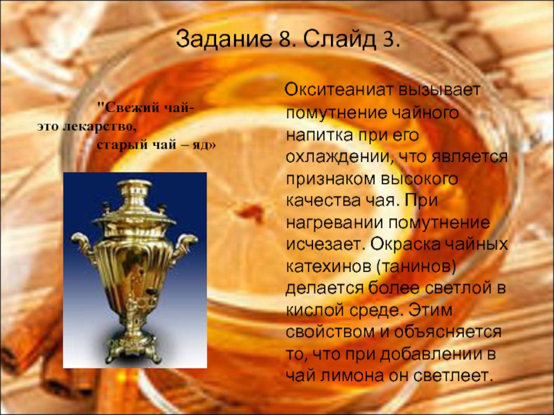 его охлаждении, что является признаком высокого качества чая. При нагревании помутнение исчезает. Окраска чайных катехинов (танинов) делается более светлой в кислой среде. Этим свойством и объясняется то, что при добавлении в чай лимона он светлеет.