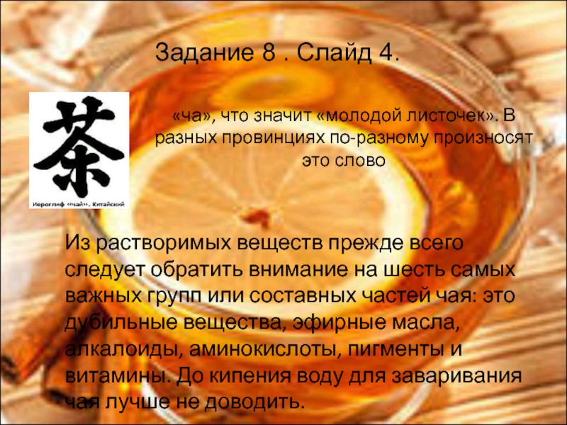 Из растворимых веществ прежде всего следует обратить внимание на шесть самых важных групп или составных частей чая: это дубильные вещества, эфирные масла, алкалоиды, аминокислоты, пигменты и витамины. До кипения воду для заваривания чая лучше не доводить.