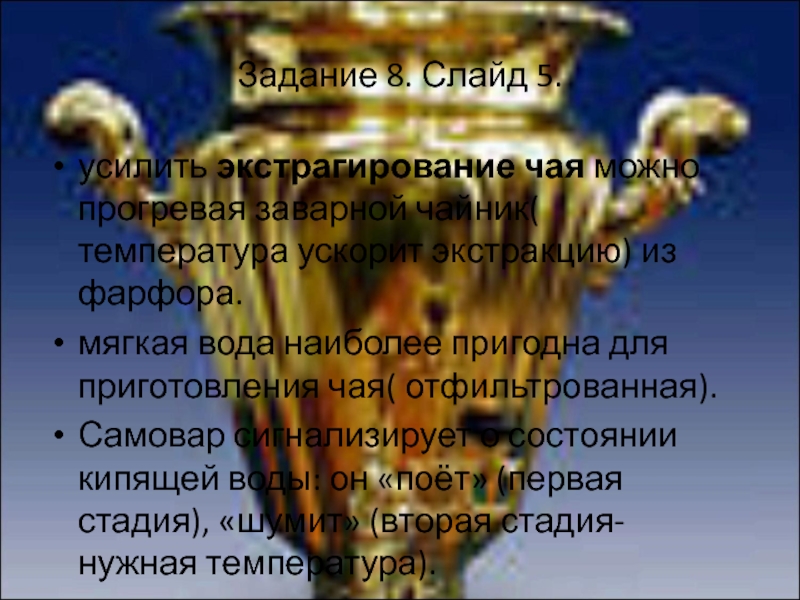 усилить экстрагирование чая можно прогревая заварной чайник( температура