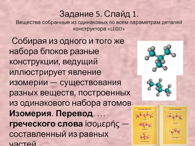 Собирая из одного и того же набора блоков разные конструкции, ведущий иллюстрирует явление изомерии — существования разных веществ, построенных из одинакового набора атомов. Изомерия. Перевод. … греческого слова ίσομερής — составленный из равных частей